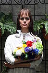 "Sunlit" Portrait The lighting in this shot is deliberately awful, about what you'd expect from noontime sunshine here in the Atlanta, GA area. (In fact, the color balance has been chosen to pretty well match the hazy sunshine here in mid-August.) The reason for the harsh lighting is to provide a real "torture test" of how cameras handle conditions of extreme contrast; and in particular, how well they do holding onto highlight detail. Look for: