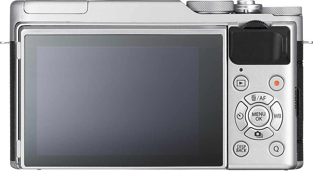 In addition to the vertical command dial and grip, the rear of the Fuji X-A10 also has a variety of buttons. There are four buttons surrounding a central "Menu OK" button which control focus, white balance, drive mode and the self-timer. Surrounding these buttons are four more buttons for playback, movie recording, Quick Menu and the display mode.