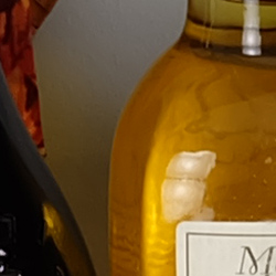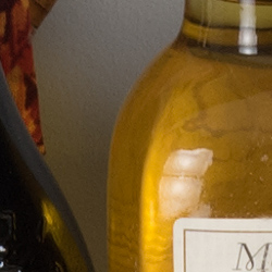 Sharpness. The Fuji X-A2 captures very smooth, slightly soft images, yet default sharpening leaves visible edge enhancement artifacts on high-contrast subjects such as obvious sharpening "halos" around the lines and letters of the bottle label above left. Edge enhancement creates the illusion of sharpness by enhancing colors and tones right at the edge of a rapid transition in color or tone.