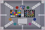 Our new "Multi Target" was first put into use in April, 2009, replacing the earlier "interim" design. This target incorporates a number of elements that combine aspects of the previous Multi target, as well as the previous Viewfinder Accuracy or "VFA" chart. Here's some of what you'll find in this target: Framing marks: This chart evolved from the earlier Viewfinder Accuracy chart, so one of its major uses is to measure viewfinder accuracy. (See notes in the Viewfinder Accuracy section, at the bottom of this page, for more information on this.) USAF resolution targets: An important use of this target is in evaluating lens quality, looking how well sharpness holds up as you move from the center to the corners of the frame. The little "USAF" resolution targets arranged at the center, in the corners, and along the diagonals are very useful for making fine judgements about blur, flare and aberrations in the image. We generally show crops of a USAF chip from a corner of the target and from the center, to show how lenses hold sharpness at wide and telephoto focal lengths. Alignment "bullseyes:" We find these graphics from the graphic arts world (used to align sheets of film in the old film-based prepress days) very useful for seeing chromatic aberration in lenses. The bold black/white elements are good for seeing the colored fringes caused by CA in the corners of the frame. MacBeth ColorChecker Chart: This is about as common a color standard as you can get these days, very widely available for only mildly exorbitant cost, and quite well controlled in its production. It thus serves as a good basis of comparison between cameras and between test setups. Imatest also understands the MacBeth colors very well, and uses them to produce its color accuracy map that we feature in all our reviews. MacBeth ColorChecker SG Chart: The ColorChecker SG chart provides a wider range of colors, to give a more detailed map of a camera's color handling. We haven't begun using this chart in the color-accuracy graphs we routinely offer, but expect to do so at some point in the future. In the meantime, we sometimes refer to this chart internally, to get a more complete idea of what a camera's color map looks like. Log C/F Target: The progressive resolution pattern located just below the center of the target is a Log C/F (logarithmic contrast vs spatial frequency) chart. Digital camera noise reduction routines work by looking at levels of local contrast, flattening-out detail at progressively lower spatial frequencies as the local contrast decreases. (This is very commonly seen in human hair, grass, foliage, and other subjects with subtly-contrasting fine detail.) This chart lets Imatest analyze just how a camera makes the tradeoff between contrast, detail, and image noise. Color Starbursts: The six circular starburst elements arranged around the target are intended to reveal de-mosaicing artifacts and color-dependent resolution issues. The six starbursts provide examples of each combination of RGB colors intersecting each other. (That is, red, green, and blue against black, plus red against green, green against blue, and blue against red.) Given that the most common sensor RGB color filter pattern (the so-called Bayer) pattern has twice as many green pixels as red or blue, you'll generally see that the green/black starburst shows the best resolution, while the blue/red one shows the worst. The effects of different sensor geometries and color filter array patterns will be revealed here. Musicians Image: Synthetic test patterns only tell you so much. While we have a lot of pictorial images in our other test targets, we thought it would be useful to include a small "natural" image here as well.