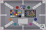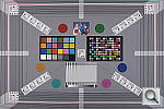 Our new "Multi Target" was first put into use in April, 2009, replacing the earlier "interim" design. This target incorporates a number of elements that combine aspects of the previous Multi target, as well as the previous Viewfinder Accuracy or "VFA" chart. Here's some of what you'll find in this target: Framing marks: This chart evolved from the earlier Viewfinder Accuracy chart, so one of its major uses is to measure viewfinder accuracy. (See notes in the Viewfinder Accuracy section, at the bottom of this page, for more information on this.) USAF resolution targets: An important use of this target is in evaluating lens quality, looking how well sharpness holds up as you move from the center to the corners of the frame. The little "USAF" resolution targets arranged at the center, in the corners, and along the diagonals are very useful for making fine judgements about blur, flare and aberrations in the image. We generally show crops of a USAF chip from a corner of the target and from the center, to show how lenses hold sharpness at wide and telephoto focal lengths. Alignment "bullseyes:" We find these graphics from the graphic arts world (used to align sheets of film in the old film-based prepress days) very useful for seeing chromatic aberration in lenses. The bold black/white elements are good for seeing the colored fringes caused by CA in the corners of the frame. MacBeth ColorChecker Chart: This is about as common a color standard as you can get these days, very widely available for only mildly exorbitant cost, and quite well controlled in its production. It thus serves as a good basis of comparison between cameras and between test setups. Imatest also understands the MacBeth colors very well, and uses them to produce its color accuracy map that we feature in all our reviews. MacBeth ColorChecker SG Chart: The ColorChecker SG chart provides a wider range of colors, to give a more detailed map of a camera's color handling. We haven't begun using this chart in the color-accuracy graphs we routinely offer, but expect to do so at some point in the future. In the meantime, we sometimes refer to this chart internally, to get a more complete idea of what a camera's color map looks like. Log C/F Target: The progressive resolution pattern located just below the center of the target is a Log C/F (logarithmic contrast vs spatial frequency) chart. Digital camera noise reduction routines work by looking at levels of local contrast, flattening-out detail at progressively lower spatial frequencies as the local contrast decreases. (This is very commonly seen in human hair, grass, foliage, and other subjects with subtly-contrasting fine detail.) This chart lets Imatest analyze just how a camera makes the tradeoff between contrast, detail, and image noise. Color Starbursts: The six circular starburst elements arranged around the target are intended to reveal de-mosaicing artifacts and color-dependent resolution issues. The six starbursts provide examples of each combination of RGB colors intersecting each other. (That is, red, green, and blue against black, plus red against green, green against blue, and blue against red.) Given that the most common sensor RGB color filter pattern (the so-called Bayer) pattern has twice as many green pixels as red or blue, you'll generally see that the green/black starburst shows the best resolution, while the blue/red one shows the worst. The effects of different sensor geometries and color filter array patterns will be revealed here. Musicians Image: Synthetic test patterns only tell you so much. While we have a lot of pictorial images in our other test targets, we thought it would be useful to include a small "natural" image here as well.