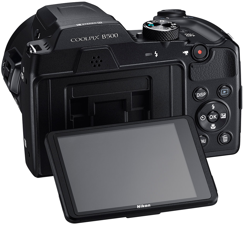 To make it easier for users to capture images and video from difficult angles, the Nikon Coolpix B500 has a tilting 921k-dot TFT LCD display. Its display provides 98% frame coverage when shooting and 100% image area during playback. Like its predecessor, the Coolpix B500 does not have an eye-level electronic viewfinder.