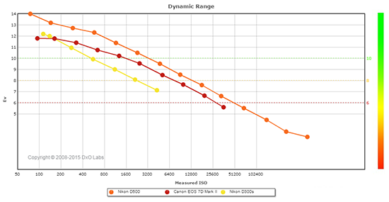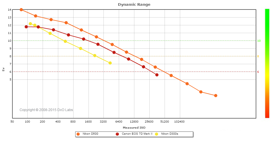 The Nikon D500's dynamic range is also decidedly better than Canon's 7D Mark II across the ISO spectrum, with a 2.2 EV advantage at base ISO, however the advantage isn't as stark as compared to the D300S at higher ISOs, but still quite significant.