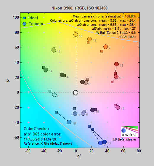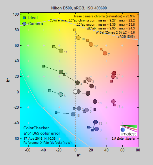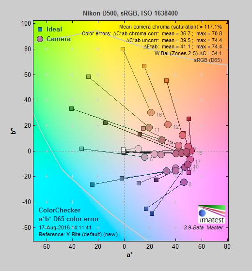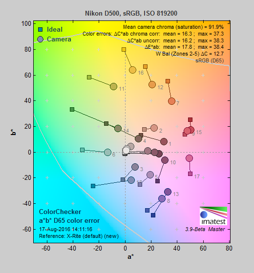 Saturation. The Nikon D500 pumps dark blues a lot, dark green, dark orange, and reds moderately, and most other colors slightly, though yellow and aqua are slightly undersaturated. Overall, mean saturation levels are a little higher than average at 15.3% oversaturated at ISO 100 versus a more typical 10%, however colors are quite pleasing and vibrant in real-world images as a result. The D500's default mean saturation is fairly consistent at low to moderately high ISOs, but starts to fall off at ISO 51,200, to a minimum of 91.9% at ISO 819,200. Camera JPEGs are quite discolored at extended ISOs above 204,800, though, with a red or magenta tint, so take those numbers with a grain of salt. Most consumer digital cameras produce color that's more highly saturated (more intense) than found in the original subjects. This is simply because most people like their color a bit brighter than life.