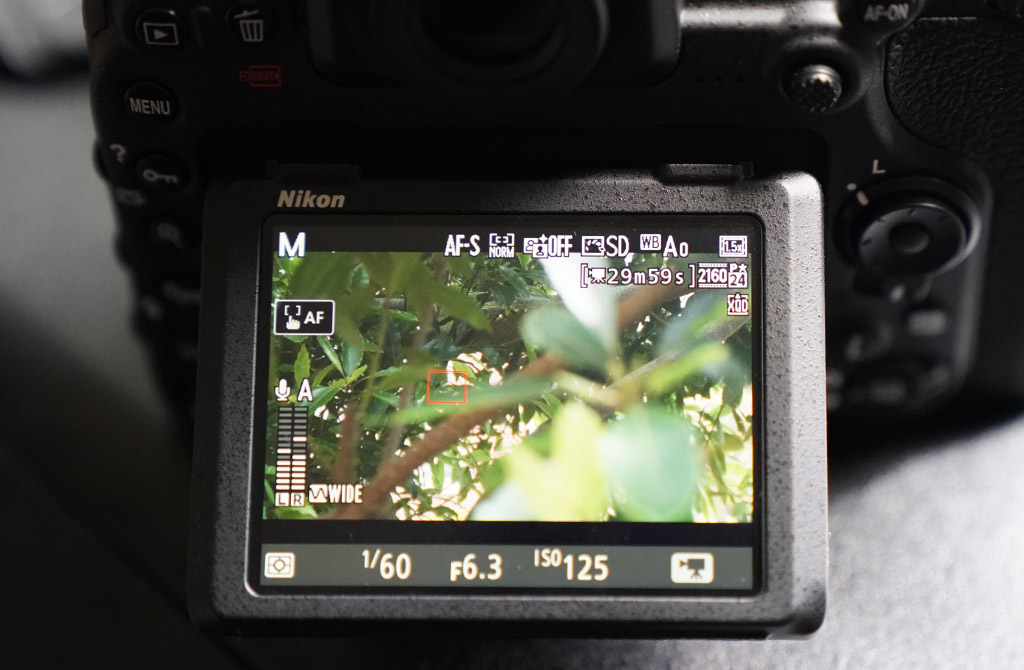 The D500 offers touch-focusing capability thanks to its touchscreen, and it does work for the most part. It's not particularly clean, however, and if you were to focus while recording, the "hunting" that occurs will make it exceedingly obvious to your viewer that you were using autofocus. In short, it doesn't look natural. This is ok, however, in some situations as it can be used to quickly nab focus and then switch to manual focus, rather than worrying with manual focus and digital magnification. Additionally, though relatively quick to lock onto focus, the touchscreen doesn't seem to be particularly sensitive, and often got the points I tapped incorrect (it would highlight a section next to my fingertip, or would hunt briefly before stopping with nothing in focus). For video autofocus, it's nowhere near market leading, but would likely qualify as "at par."