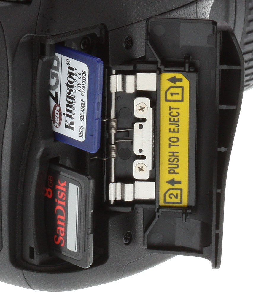 Memory/storage. The Nikon D610 caters to storage with dual Secure Digital card slots, located in the right side of the hand grip.