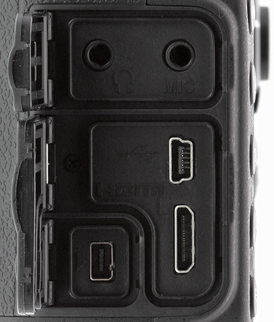 Audio. Audio is taken from a built-in monaural microphone, or an external stereo microphone, plugged into a 3.5mm jack on the left side of the camera body. There's also another jack into which you can attach a pair of headphones, letting you monitor audio levels.