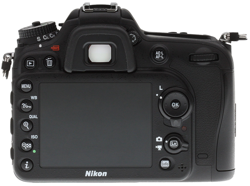 Just as in the earlier D7100, the dust-and-weather sealed body has magnesium-alloy panels top and rear, but is polycarbonate on other sides, including this front surface. (A magnesium-alloy chassis underlies all of this, incidentally.)