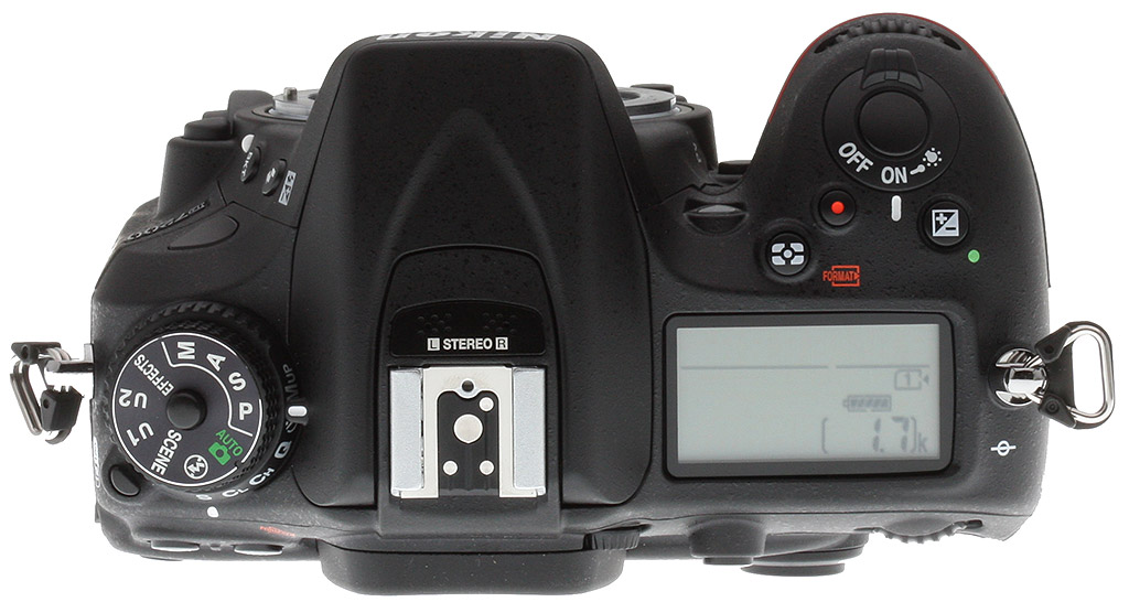 Things are also much the same on the top deck. At left is the locking mode dial, and at right, the power switch, shutter button, movie button, metering mode button and exposure compensation button, all sitting directly in front of the top-deck LCD info display. At center is the popup flash strobe and hot shoe, between which are two eight-hole grilles for both channels of the built-in stereo microphone.