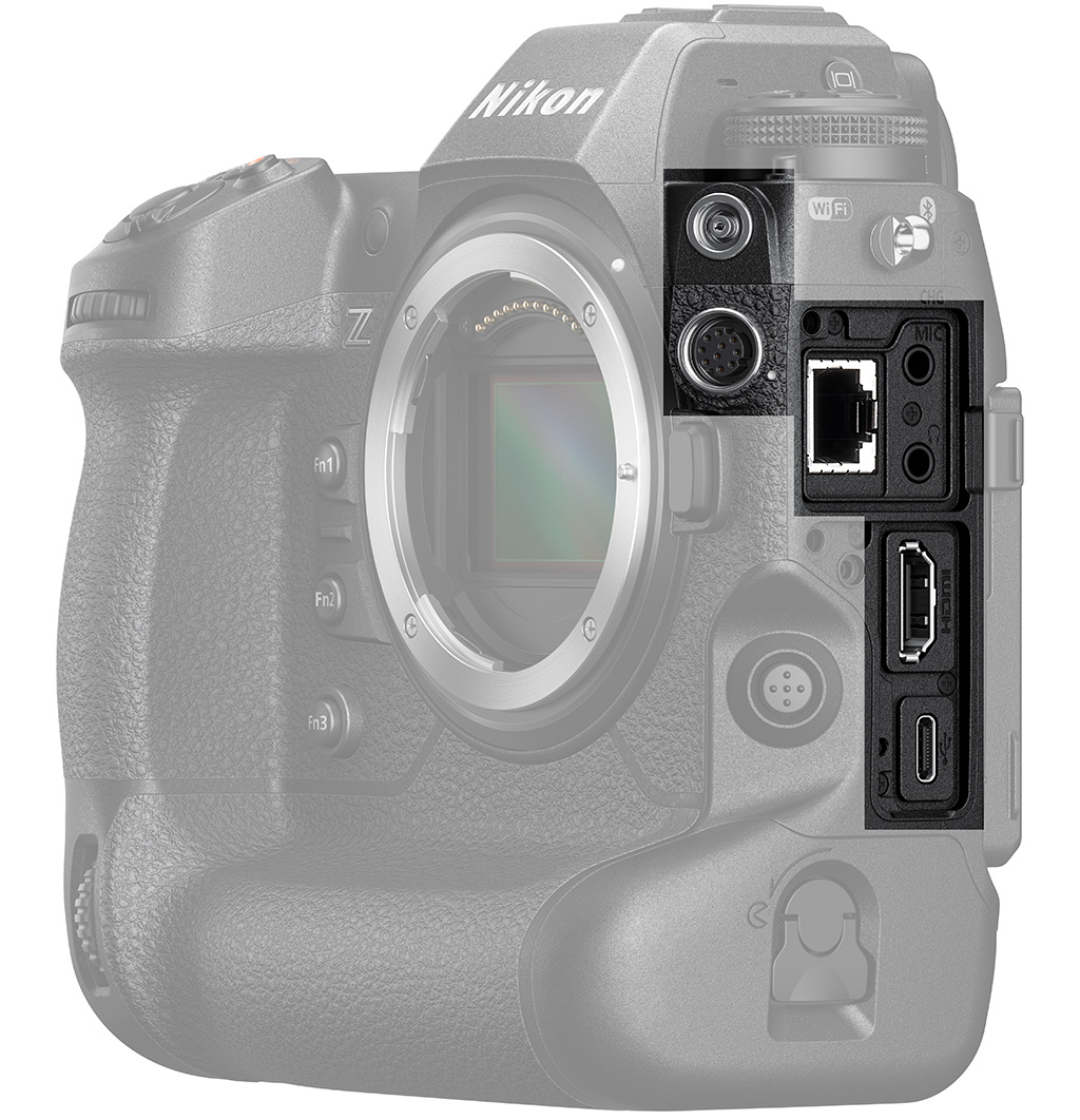 We've touched on some of the Z9's various ports, including the dual CFexpress Type B (XQD) card slots, HDMI Type A and dual audio jacks. The Z9 also includes a 1000BASE-T RJ-45 Ethernet port, 10-pin accessory port (for remotes), and a USB Type C connector.