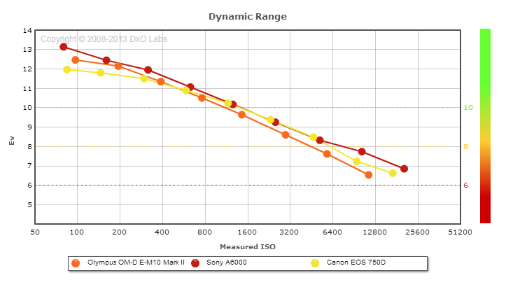 Here, we compare the Olympus E-M10 II's dynamic range to a couple of competing cameras, the Canon T6i/750D DSLR and the Sony A6000 mirrorless ILC. (DxOMark dynamic range test results for the E-M10 II are very similar to the E-M10, so we didn't compare them here.)
