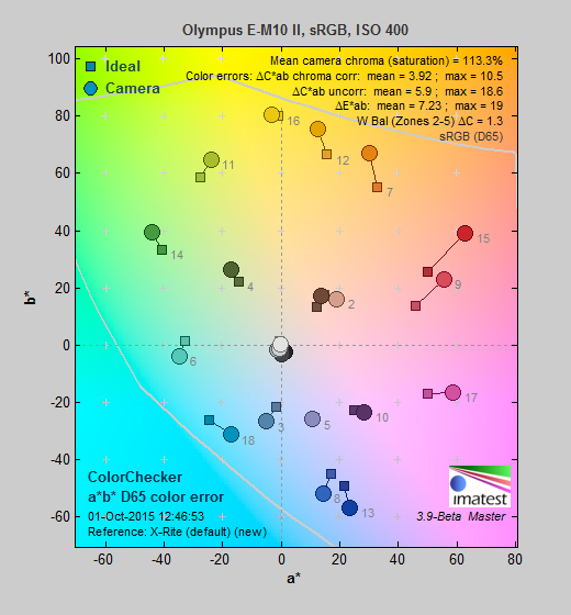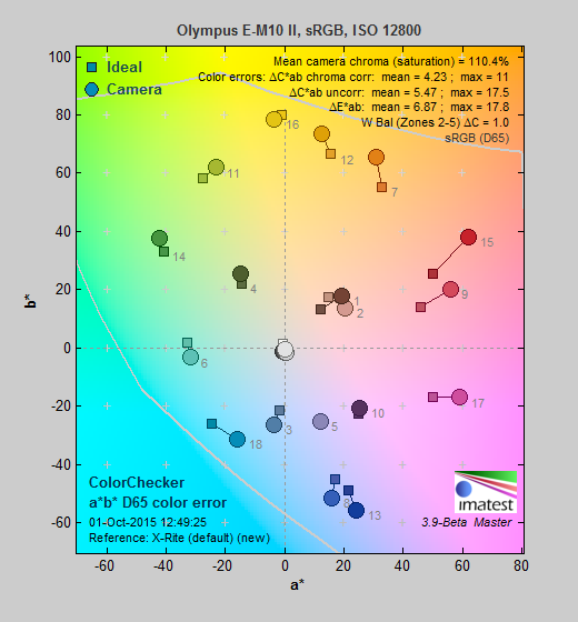 | In the diagram above, the squares show the original color, and the circles show the color that the camera captured. More saturated colors are located toward the periphery of the graph. Hue changes as you travel around the center. Thus, hue-accurate, highly saturated colors appear as lines radiating from the center. Mouse over the links to compare ISOs and click for a larger version. | ||