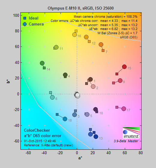 Saturation. The Olympus E-M10 II pushes darker reds by a fair amount and a number of other colors moderately, but most colors are pretty close to accurate in terms of saturation. Default mean saturation at base ISO of 200 is 113.5% (13.5% oversaturated), which is a little higher than average. Mean saturation falls fairly gradually and only mildly as ISO rises, to a minimum of 108.3% at ISO 25,600 which is still quite vibrant for the sensitivity. Most consumer digital cameras produce color that's more highly saturated (more intense) than what's found in the original subjects. This is simply because most people like their color a bit brighter than life.