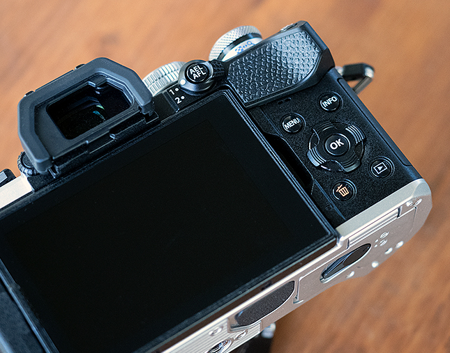 Moving to the back of the camera, we see a pretty standard array of camera controls -- again, the body design is identical to the E-M5 Mark III. Primary controls consist of a 4-way directional control and a central "OK" button. However, the camera lacks a multi-directional joystick-like control, which2 is to be expected given that this camera body is the same as the prior model. However, it's still somewhat disappointing, as it's a very common and handy control. That said, the 4-way directional buttons provide instant AF point adjust, like on the E-M1 Mark II, which I like as well.