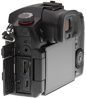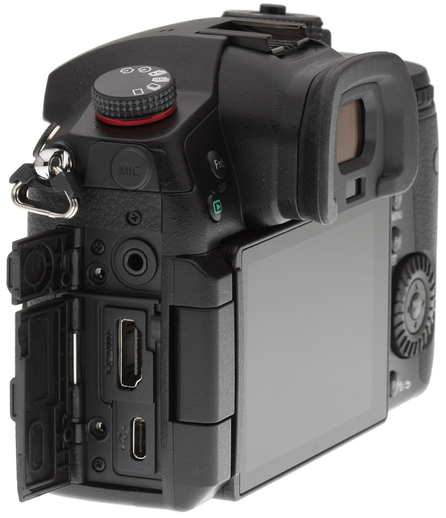 Wireless connectivity options, as in the GH5, include Wi-Fi and Bluetooth radios, but not NFC for easy Android pairing. Wired connectivity includes a USB-C port compatible with SuperSpeed USB 3.1 Gen1, a Type-A HDMI port, 3.5mm microphone / line level input and headphone jacks, and a 2.5mm remote jack.