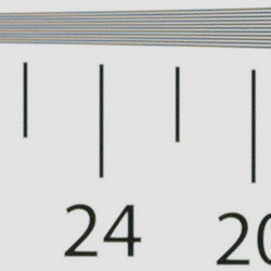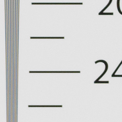 In camera JPEGs, our laboratory resolution chart reveal sharp, distinct line patterns to about 2,300 lines per picture height horizontally, and about 2,300 lines in the vertical direction. (Some might argue for higher, but aliasing artifacts begin to appear before that.) Complete extinction of the pattern occured just after 2,800 lines both horizontally and vertically. We weren't able to extract significantly more high-contrast resolution by processing the Panasonic GX7's RW2 file using Adobe Camera Raw, and the ACR conversion also shows some color moiré which is practically nonexistent in the camera JPEG.