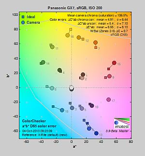 Saturation. The Panasonic GX7 produces slightly lower mean saturation levels compared most cameras at default settings. Mean saturation is 106.5% (6.5% oversaturated) at the base ISO of 200, which drops off after ISO 1,600 to 101.3% at ISO 25,600. The Lumix GX7 pushes dark red and dark blues a fair bit and some other colors slightly, but undersaturates yellow, aqua and cyan. Most consumer digital cameras produce color that's more highly saturated (more intense) than found in the original subjects. This is simply because most people like their color a bit brighter than life.