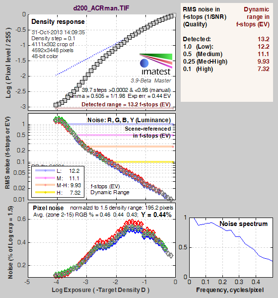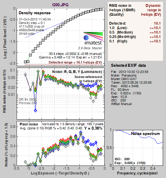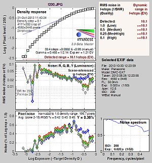 What makes most sense then, is to specify useful dynamic range in terms of the point at which image noise reaches some agreed-upon threshold. To this end, Imatest computes a number of different dynamic range measurements, based on a variety of image noise thresholds. The noise thresholds are specified in terms of f-stops of equivalent luminance variation in the final image file, and dynamic range is computed for noise thresholds of 1.0 (low image quality), 0.5 (medium image quality), 0.25 (medium-high image quality) and 0.1 (high image quality). For most photographers and most applications, the noise thresholds of 0.5 and 0.25 f-stops are probably the most relevant to the production of acceptable-quality finished images, but many noise-sensitive shooters will insist on the 0.1 f-stop limit for their most critical work. A full discussion of all the data Imatest produces is really beyond the scope of this review: Visit the Imatest website for details of what the program measures, how it performs its computations, and how to interpret its output.