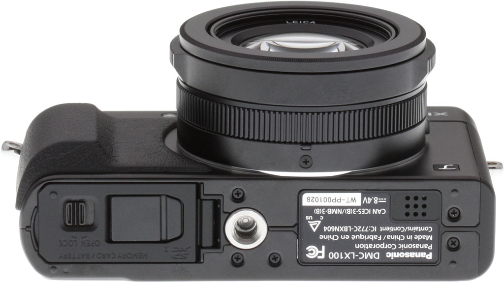 And finally, we come to the base of the Panasonic LX100. At camera left is a nine-hole grille for the camera's speaker. Moving right, you come to a metal tripod mount, sadly situated off the lens' optical axis, a position less than ideal for tripod-mounted panoramas. (Although it's easy enough to source a bracket and reposition the camera over the tripod correctly, if you shoot a lot of panos.)