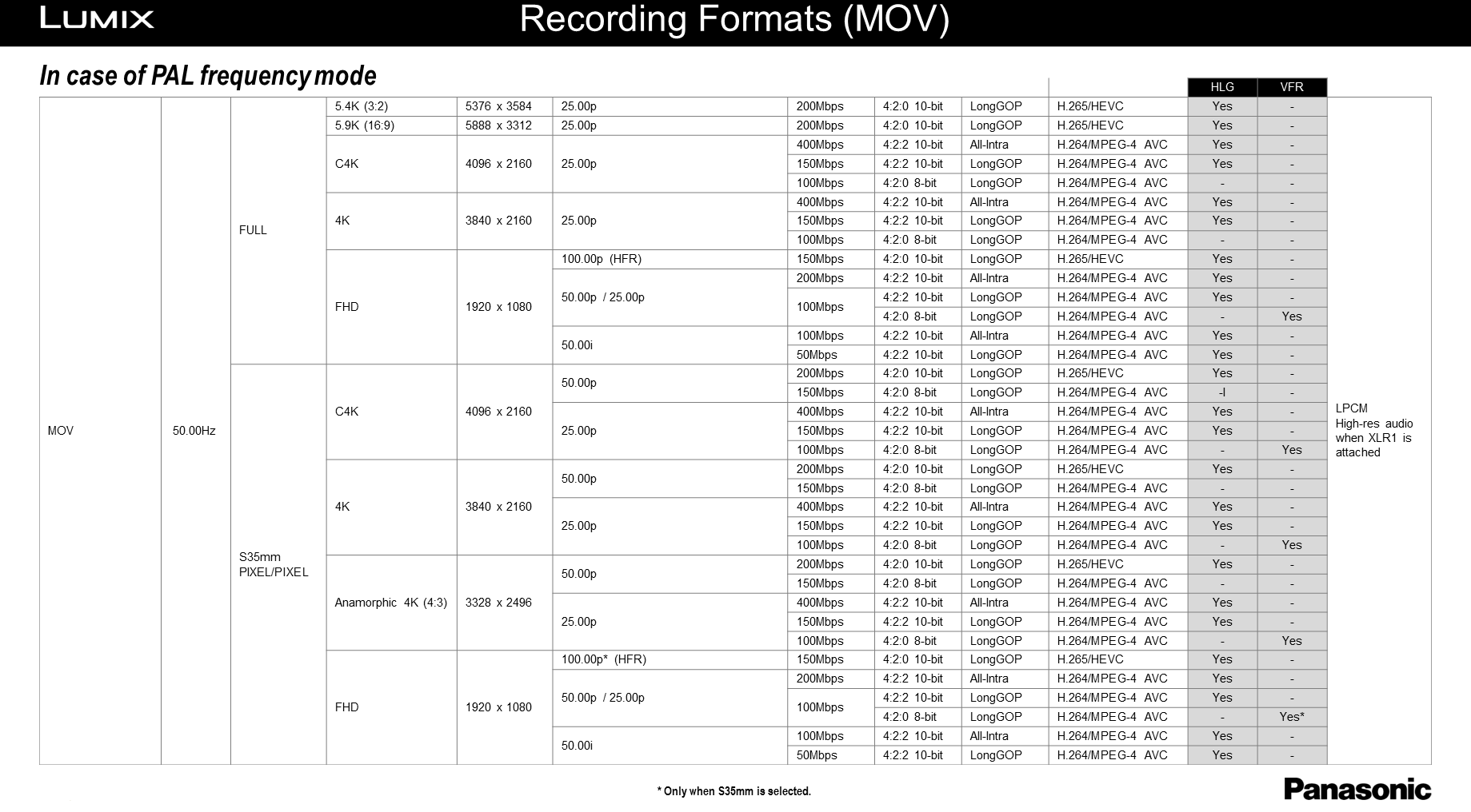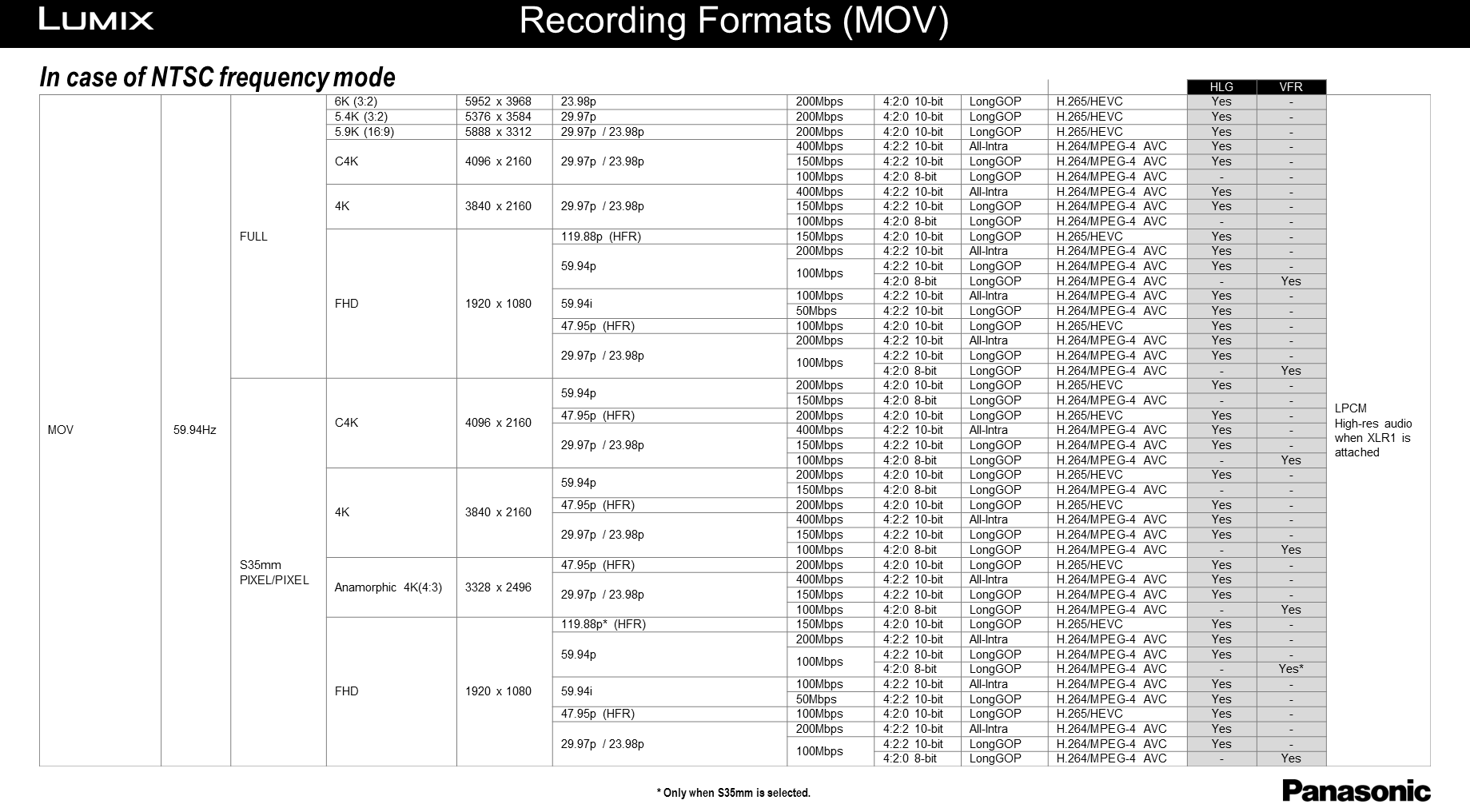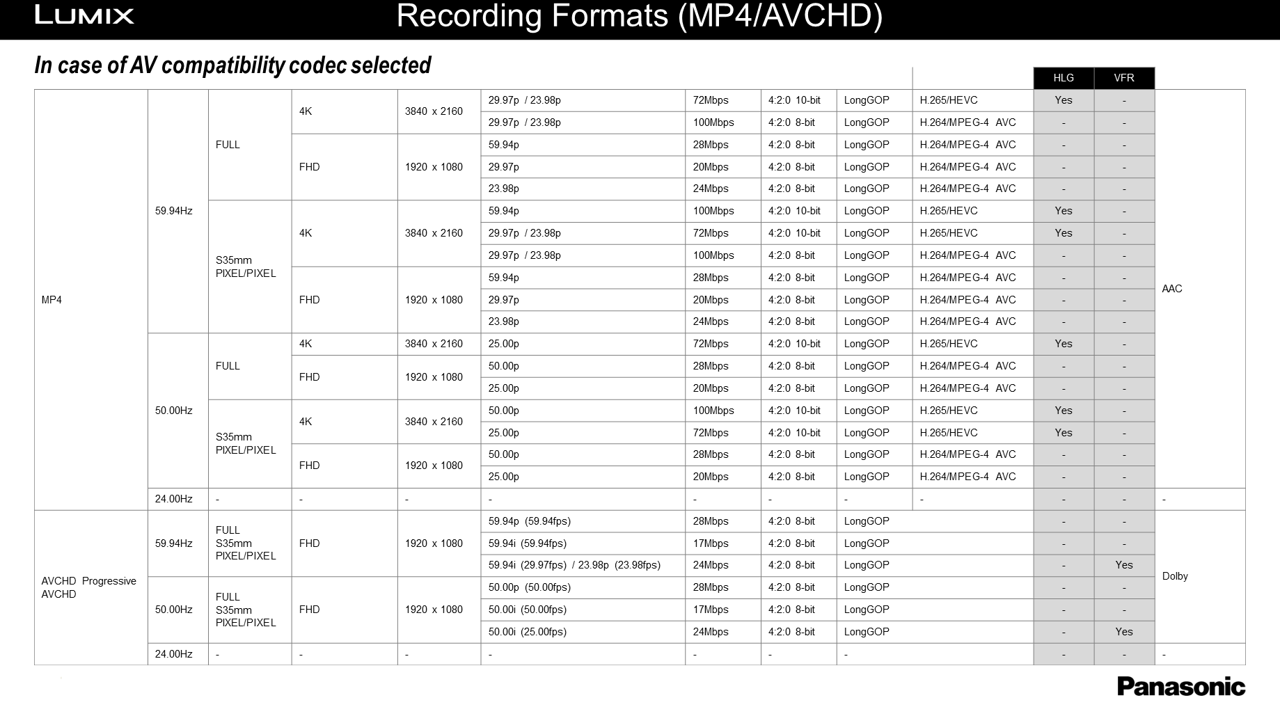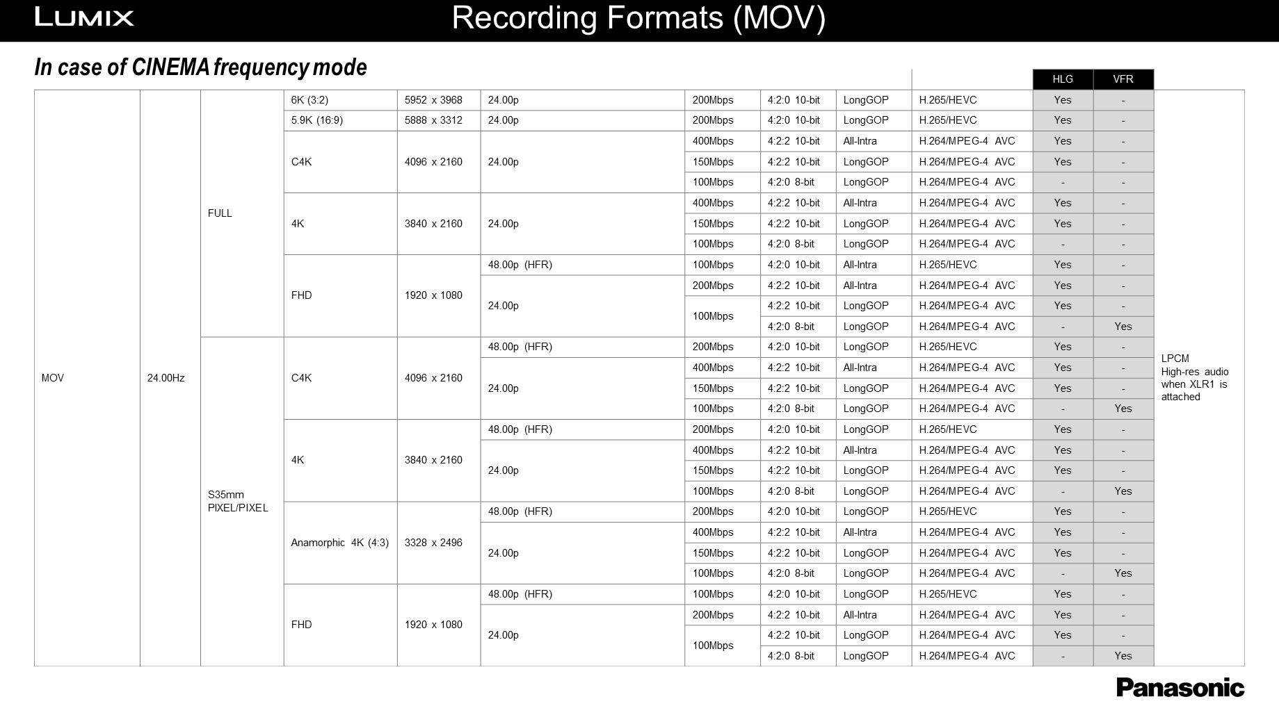 Click on these links for tables listing the S1H's many video recording format options: