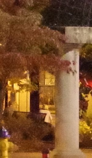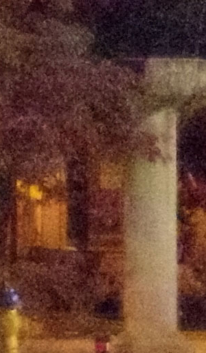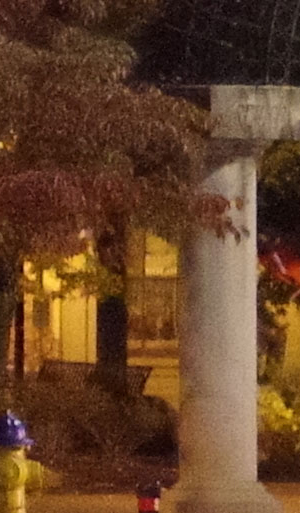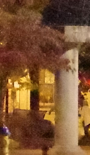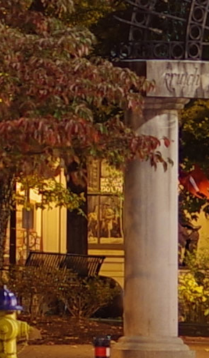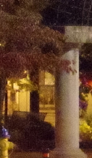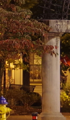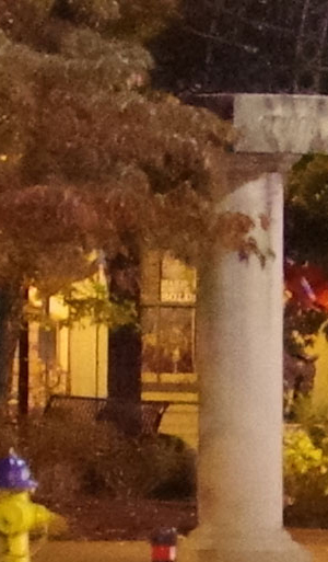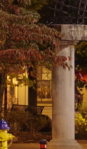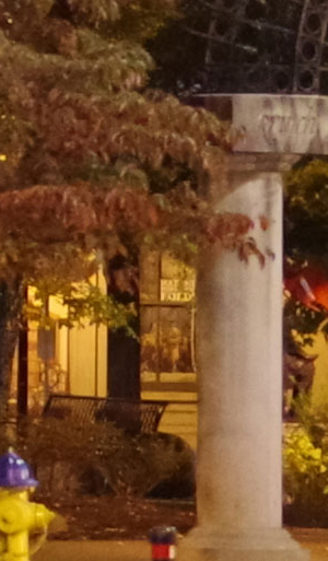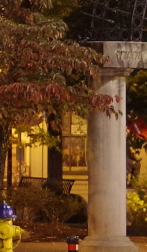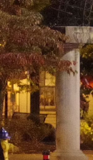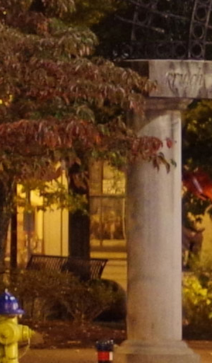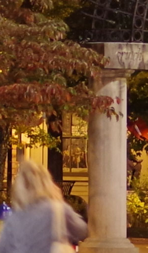 ISO 1600: The first hint of noise is just starting to show through when viewed 1:1, but it's subtle. By the way, ignore the changes in brightness of the column in the foreground; it proved impossible to find anywhere downtown where the light levels didn't change with regularity. And while the leaves look softer in the K-1 II's crop here, note the 1/15th second shutter speed required for the exposure. It's likely they just moved a little from a momentary breeze during exposure. |