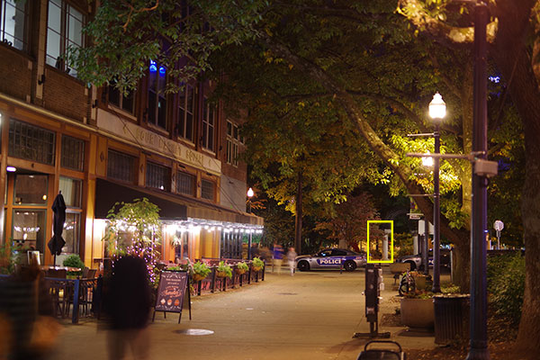 Below, you'll find both an overall view of the scene I shot with both cameras, and a series of 1:1 crops from the same area of the image with each camera at one-stop increments across their respective sensitivity ranges. (The area I selected for the crops is outlined in yellow in the overall view.)