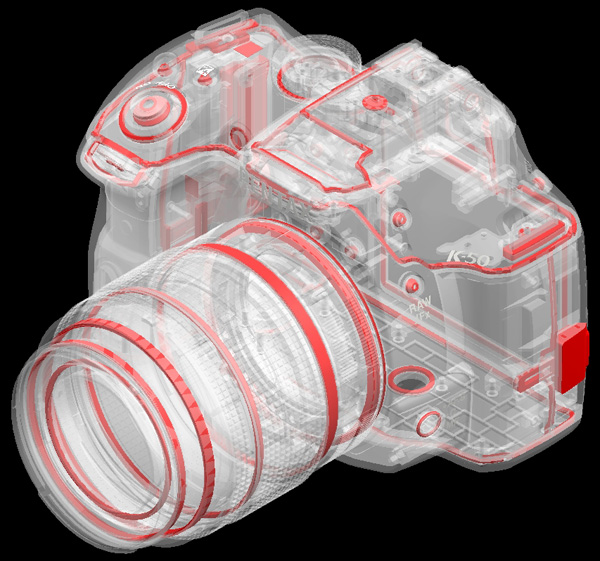 The body is constructed of reinforced polycarbonate over a stainless steel chassis. In addition to being fully weather sealed, it's also dustproof and cold-resistant down to 14-degrees Fahrenheit (-10 degrees Celsius). The K-50 features a Pentax KAF2 bayonet stainless steel mount, and is compatible with KAF3, KAF2, KAF and KA lenses (as well as K mount, 35mm screw mount and Pentax 645/67 medium format lenses with an adapter or with restrictions).