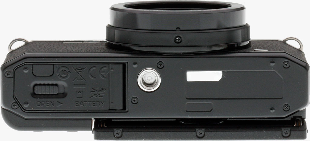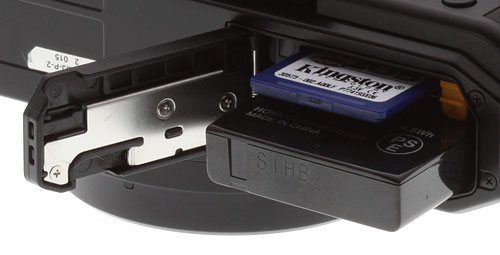 Finally, the bottom of the Pentax MX-1 features a metal tripod socket, which is unfortunately both quite far from the central axis of the lens, and very close to the battery / flash card compartment door, making it impossible to access either while the camera is tripod-mounted. The locking, spring-loaded door has a small rubber cutout that permits access for a DC coupler, since there's no dedicated DC input on the camera body. Behind this door, the 1,250 mAh, 3.6V, 4.5Wh Pentax D-LI106 lithium ion rechargeable battery is held in place by a yellow, spring-loaded latch, and the battery itself is keyed so it can only be fully inserted with the correct orientation. The adjacent Secure Digital card slot accepts both SDHC and SDXC card types.