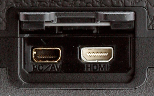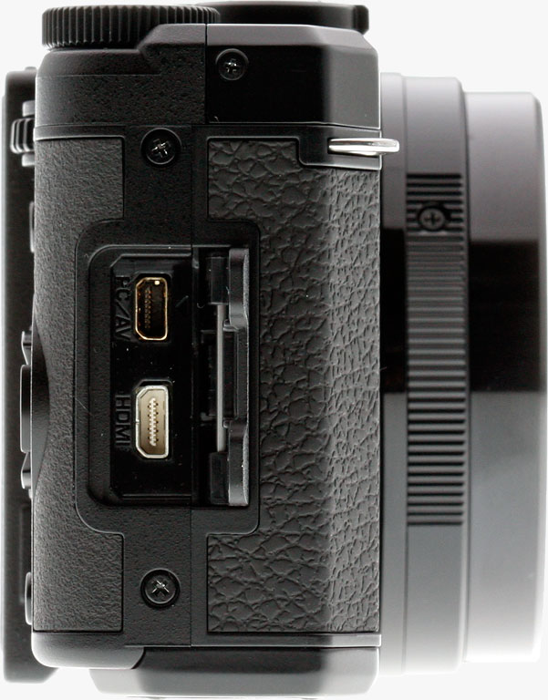 On the right-hand side of the Pentax MX-1 body, there's a small hinged plastic door. Behind this are the camera's only connectivity options: a combined Micro USB / standard-def composite video output, and a Micro Type-D HDMI high-def video output.