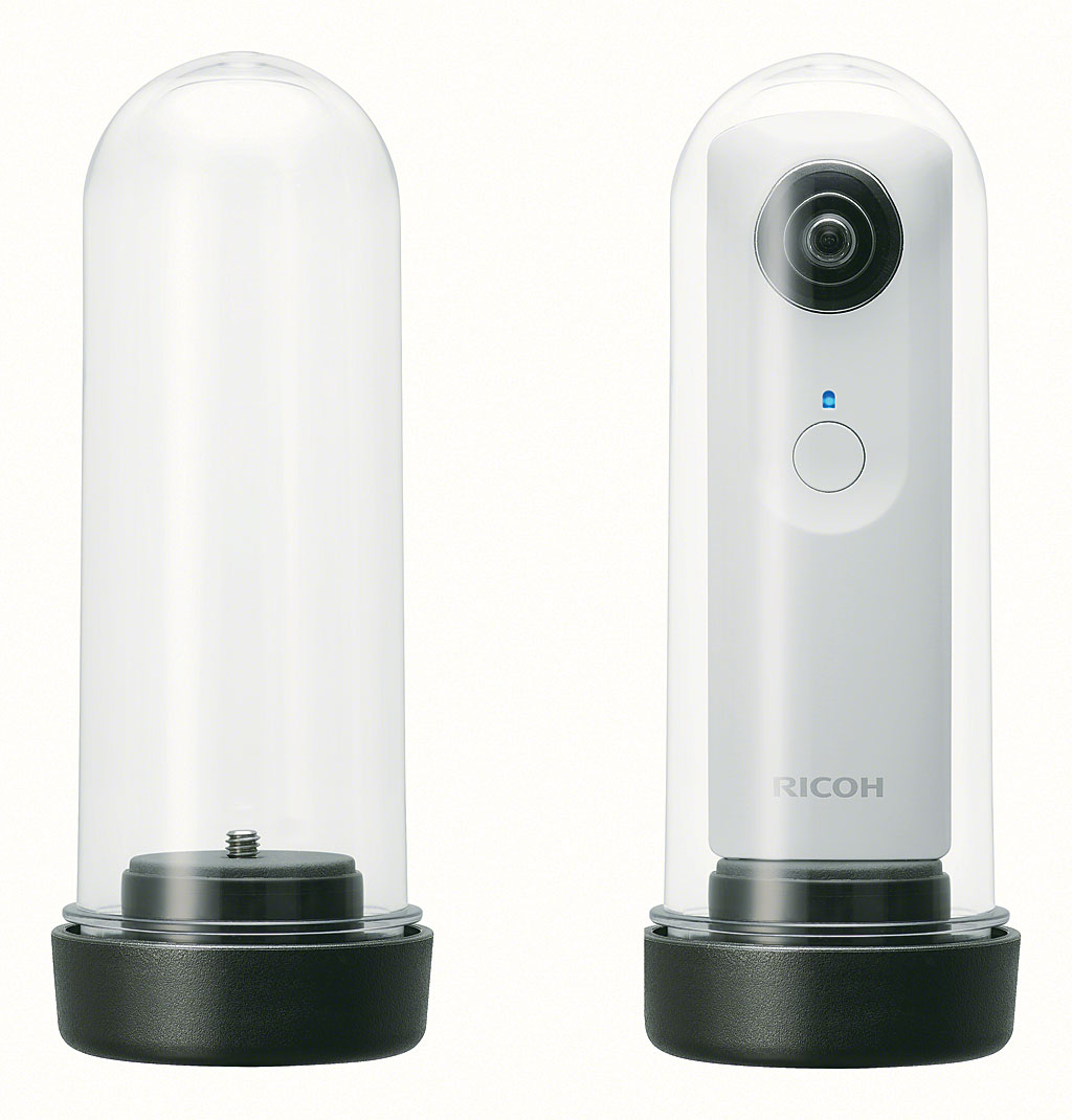 While the Theta S is neither waterproof nor otherwise as rugged as a GoPro, another accessory allows it to be used in rainy or dusty environments or even underwater, as well. It looks a bit like a chunky test tube with a removable cap and tripod mount at one end, and allows spherical stills and video to be shot at depths of up to 12 feet. We're not sure if the video recording time would be affected -- after all, placing the camera inside a sealed plastic tube is going to make it harder for heat to dissipate -- but even so this is a pretty nifty accessory, and one we'd imagine more than a few Theta S owners will want to pick up.