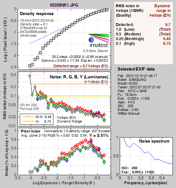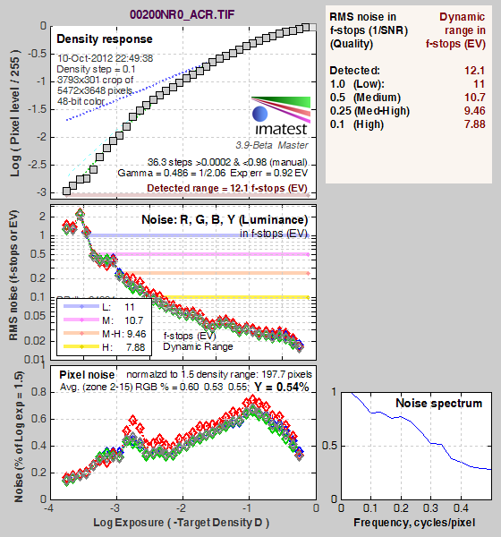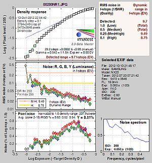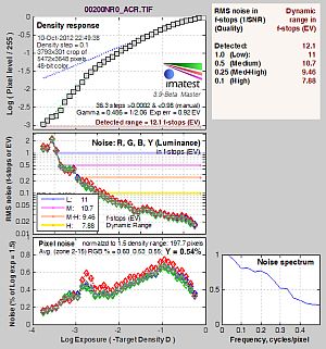 What makes most sense then, is to specify useful dynamic range in terms of the point at which image noise reaches some agreed-upon threshold. To this end, Imatest computes a number of different dynamic range measurements, based on a variety of image noise thresholds. The noise thresholds are specified in terms of f-stops of equivalent luminance variation in the final image file, and dynamic range is computed for noise thresholds of 1.0 (low image quality), 0.5 (medium image quality), 0.25 (medium-high image quality) and 0.1 (high image quality). For most photographers and most applications, the noise thresholds of 0.5 and 0.25 f-stops are probably the most relevant to the production of acceptable-quality finished images, but many noise-sensitive shooters will insist on the 0.1 f-stop limit for their most critical work. A full discussion of all the data Imatest produces is really beyond the scope of this review: Visit the Imatest website for details of what the program measures, how it performs its computations, and how to interpret its output.