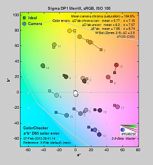 Hue. The Sigma DP1 Merrill showed a lot of small to moderate color shifts relative to the mathematically precise translation of colors in its subjects, resulting in a Delta-C color error after correction for saturation of 5.77 at base ISO. That's a little higher (worse) than average these days, and like saturation, hue accuracy dropped significantly at higher ISOs. Hue is "what color" the color is.