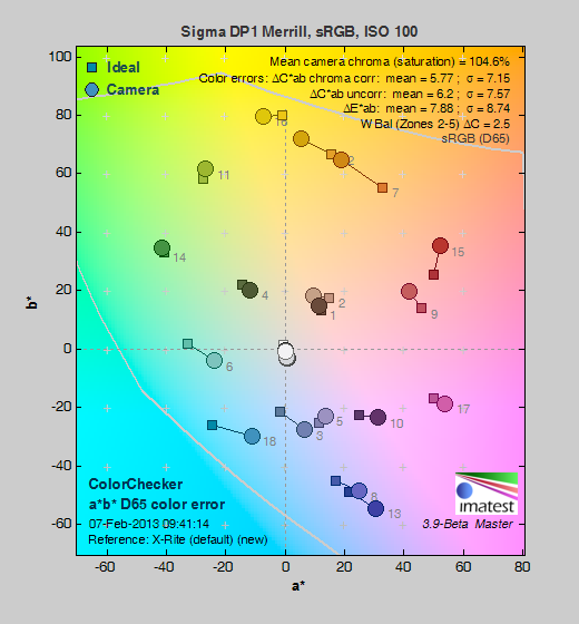Saturation. The Sigma DP1 Merrill's mean saturation of 104.6% at base ISO isn't as pumped as most cameras, so default colors may seem a little muted to some. The camera pushes deep red and blues a bit, but most other colors are pretty close to accurate or slightly desaturated from ideal. Saturation falls off rather rapidly at ISOs above 800, though, to the point where colors have lost about 50% saturation at ISO 6,400. It's not unusual to see a drop in saturation at higher ISOs, but we're not used to seeing it as dramatic as this except from other Sigma models (the SD1 had a similar drop in saturation at high ISOs). Most consumer digital cameras produce color that's more highly saturated (more intense) than found in the original subjects. This is simply because most people like their color a bit brighter than life.