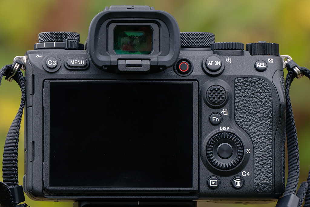 To the right of the display is Sony's standard rotating selection wheel, an Fn button, autofocus sub-selector joystick, dedicated AF-ON button, and AEL button, and a dedicated movie record button. To the left of the viewfinder are C3 and Menu buttons. The layout is certainly familiar.