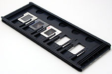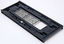 The third adapter that accompanies the scanner is the FH-869S 120/220 strip film adapter, which holds as many as four 6x4.5 frames, three 6x6 frames, or two 6x7, 6x8, or 6x9 frames. Lining the top of the adapter on both edges are two flip-up plastic holders or clamps that keep the film in position. To insert film, you simply flip the holders upwards, and then close them again once the film is in position.