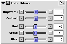 As a simpler alternative to the curves-levels window, the "Color Balance" option provides fairly rudimentary controls to adjust the brightness, contrast, and color balance of the image as a whole. (In grayscale scanning mode, only the brightness and contrast sliders will appear.) These controls work exactly as you would expect, but in our experience are of limited value for obtaining professional results. Nonetheless, they can be a quick way to make overall image adjustments, and may be the fastest way to process large numbers of noncritical scans.