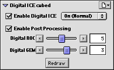 This is control central for Digital ICE, ROC, and GEM, described earlier. Digital ICE (the dust/scratch remover) has two settings, normal and fine. Fine is for use with very small defects, but affects image sharpness more. ROC (Recovery of Color) and GEM (Grain Equalization and Management) each have a range of settings, from zero to 10 for ROC, zero to four for GEM, both in arbitrary units. We found little need to mess with the ICE setting, but did observe that the range of adjustment in GEM was useful. (We didn't have any suitably faded negatives to experiment with ROC on.)