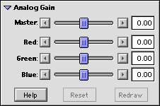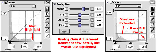 The "analog gain" control can be very useful for teasing out details from deep shadows and dark, plugged-up slides or negatives. You need to watch the histogram display in the "Curves" window though, to be sure you don't lose important highlight detail in the process. |