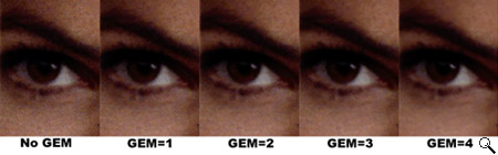 GEM stands for "Grain Equalization and Management," and is a technology to remove the effects of film grain, without affecting image sharpness. We were a little suspicious of the claim that image detail wasn't affected, as it sounded a little too much like magic. As you can see from the samples above though (click on the image for a full-sized view), it really does seem to do a pretty good job. The test image here is the familiar "Q60" test slide from Kodak, which is imaged on Ektachrome slide film. This is a fairly fine-grained emulsion, and the image itself has to be at least one generation down from whatever the original image was. Thus, the sharpness of the subject could be questioned, relative to the size of the grain artifacts. (It would be interesting to test GEM on some higher-speed film, where the grain structures would be larger relative to the detail in the image.) Still, even allowing for the limitations of the test, the results are quite impressive.