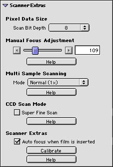 - Multi-sample scanning - Also described earlier, this option allows you to select 1, 2, 4, 8, or 16 samples per pixel. Greatly lengthens scan time at the higher settings, but noticeably reduces noise in deep shadows.