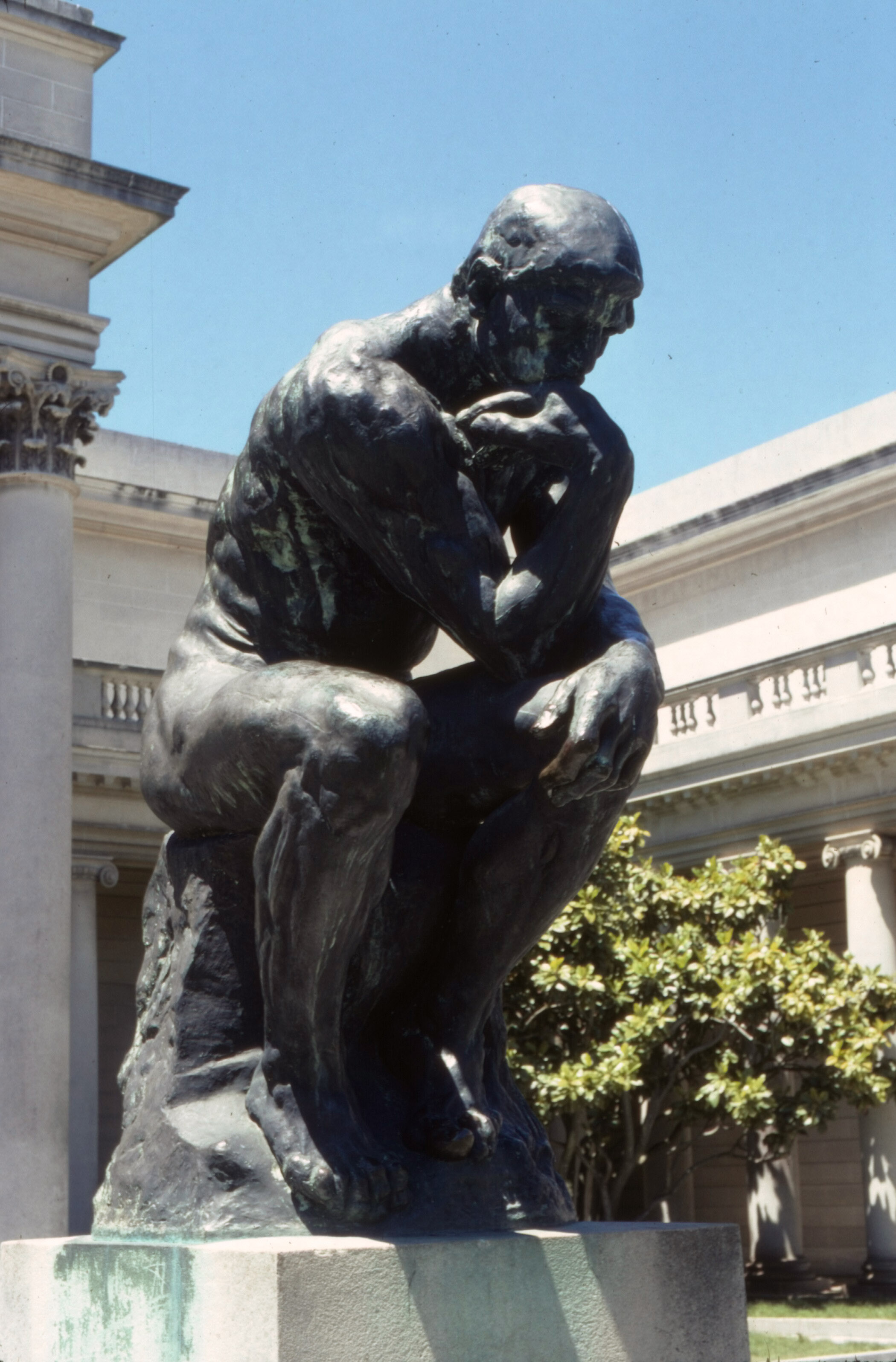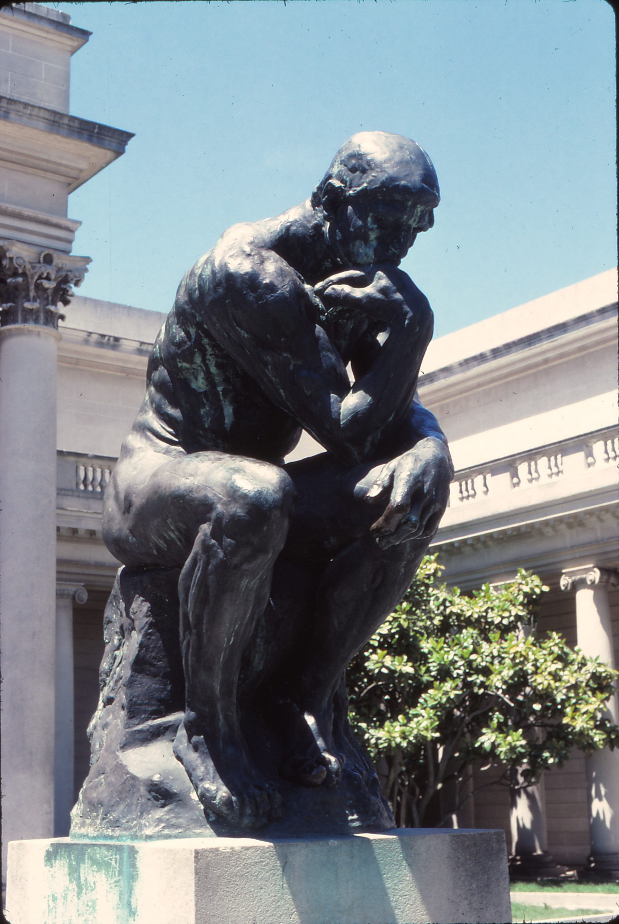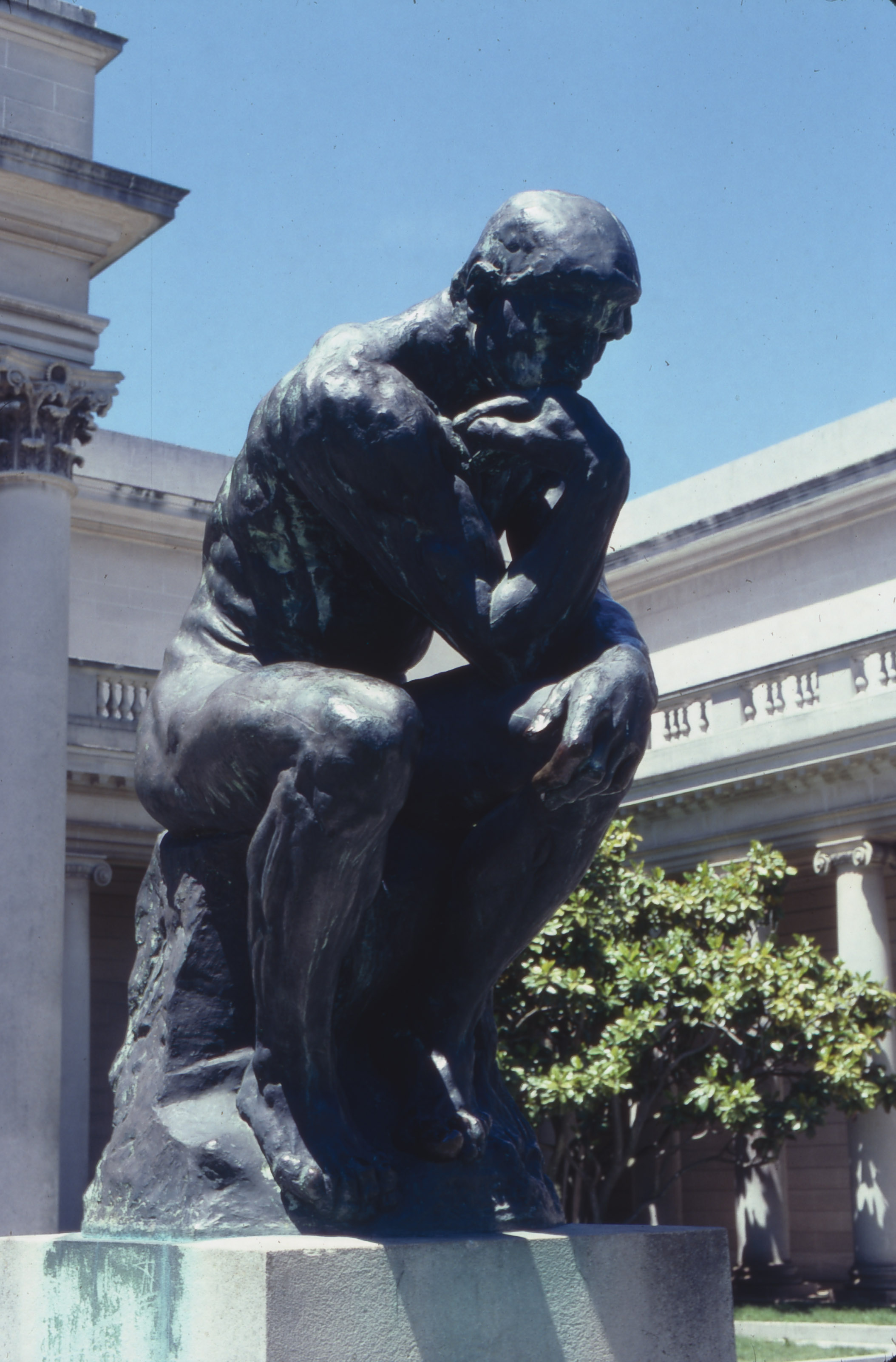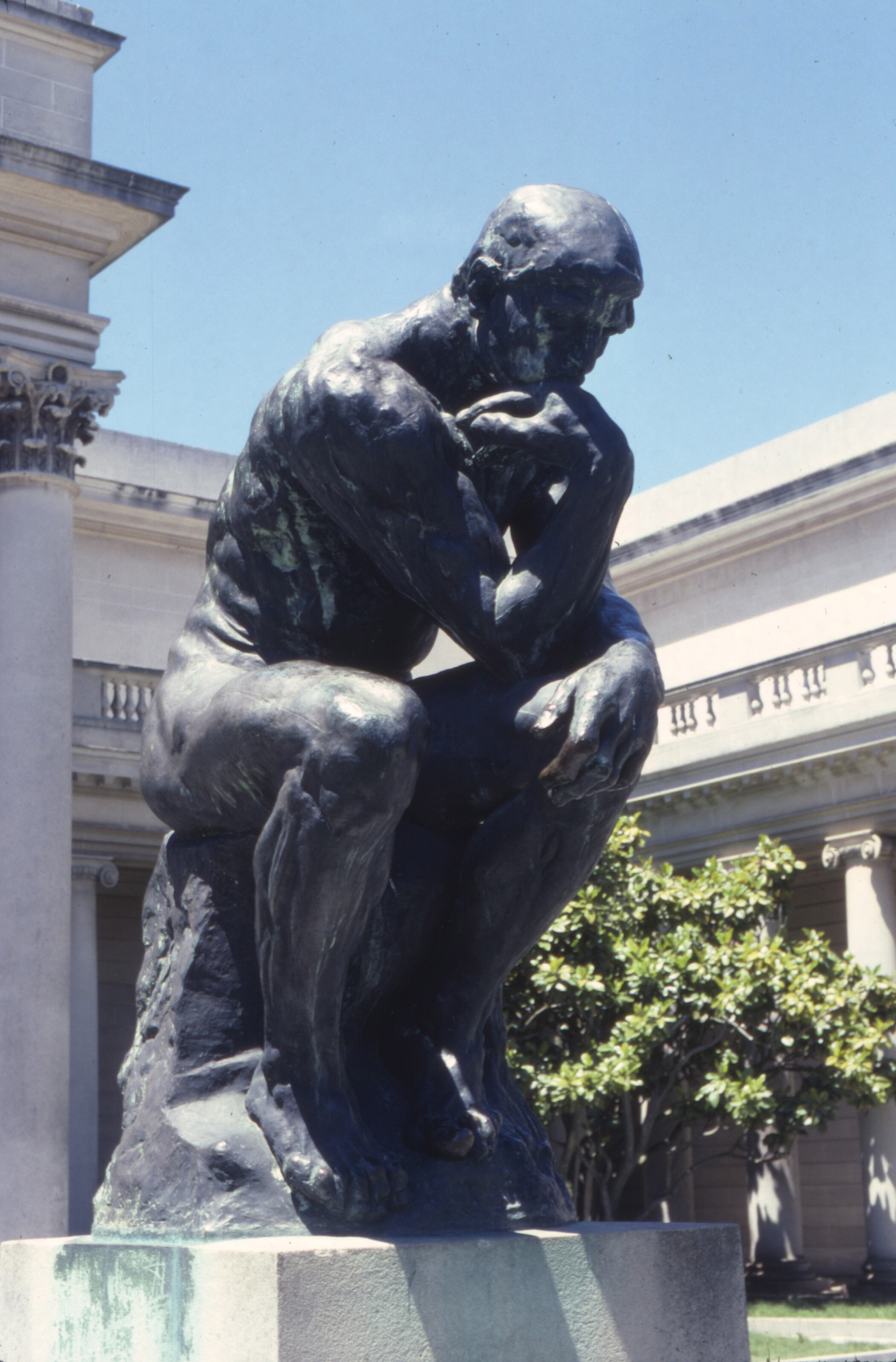 The darkest part of the image is the black between the legs of the statue. The highlight is the shiny left knee. All three scans maintained detail throughout. If you saw the original slide, that would surprise you. It's a high-contrast shot of a dark bronze in bright sunlight.