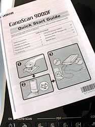 There are two stages to setting up the CanoScan 9000F. The first is the software setup, the second is the hardware installation. It's so simple that Canon doesn't bother to supply a poster. The front page of the Quick Start Guide shows you in three diagrams what to do: Insert the CD, Unlock the Scanner, Plug it in.