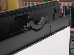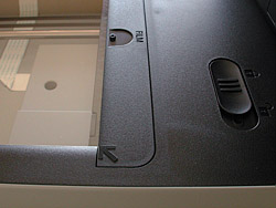 On the glass platen, an embossed arrow indicates the corner to orient your original material. Along the back edge a small pin indicates where to attach the film holders. On the front edge a small tab shows where to seat the other end of the film holders.