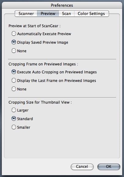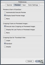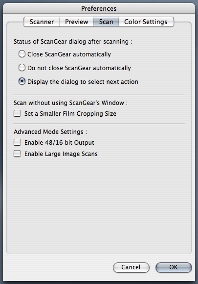 Preferences. Some of the power of ScanGear is hidden in the Preferences. The Scan panel, for example, enables 48/16-bit output (otherwise the scanner converts from 48-bit to 24-bit color and 16-bit to 8-bit grayscale). It also enables image scans up to 4.0-GB in Advanced Mode but disabling backlight correction.