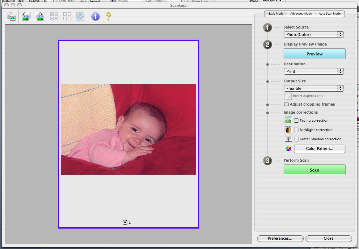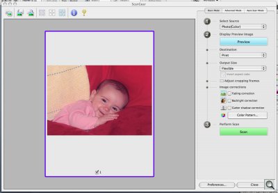 Basic Mode makes scanning as simple as possible, dividing the task into three steps: Select the Source (is a color photo, a color negative, positive film, etc.), Preview the Image (decide if you want to scan for a print or some other format, adjust the automatic crop, adjust the image (fade correction, backlight correction, gutter shadow correction), adjust the color by viewing a set of thumbnails set to different tints) and Scan the image.