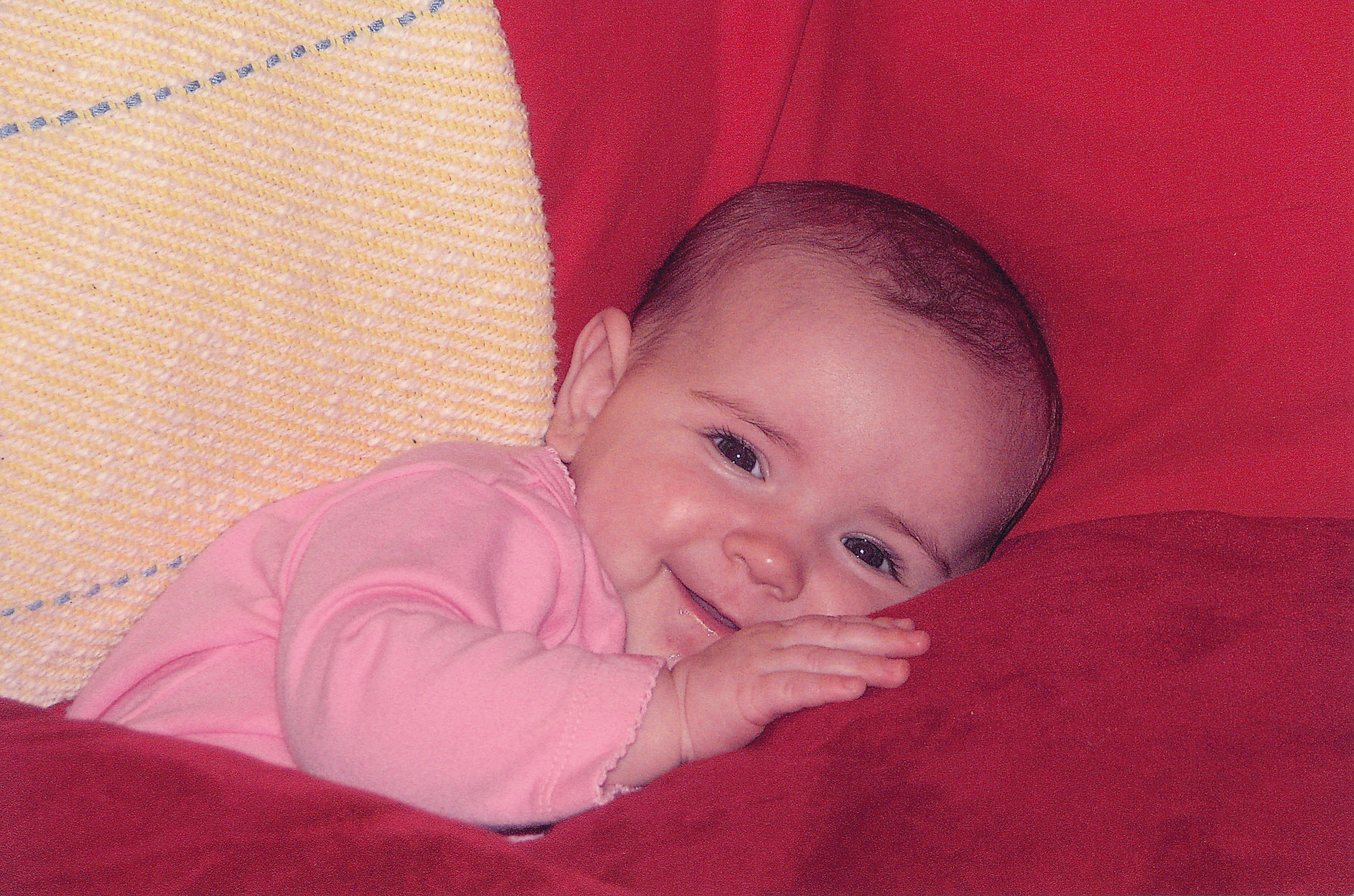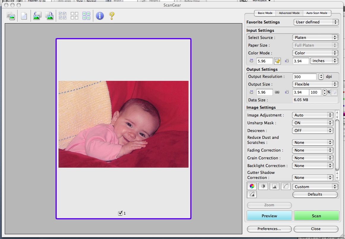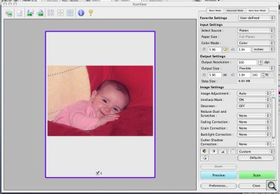 Color Photo. We started with our color print of a baby. We did a simple scan using ScanGear's Basic tab default settings and were pleased with the results. There was shadow detail and the highlights were not burned out. Eyelashes were clearly delineated and the red cushions accurately rendered, as were the flesh tones. We really saw no reason to edit the scanned image.