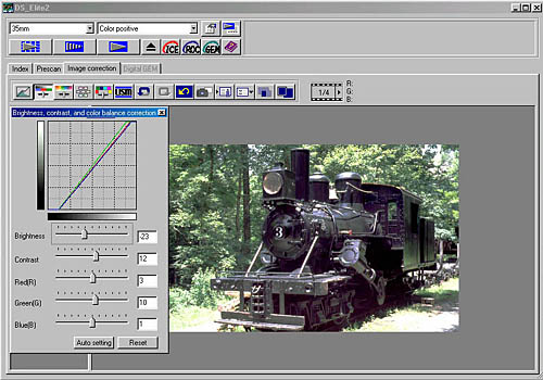 Color and detail on the DSEII were quite good. I was somewhat surprised by the sharpness of its scans, given that it uses a diffuse, fluorescent light source, which I'd always associated with slightly softer-looking scans. In my tests, the DSEII delivered about the highest resolution I've yet seen from a scanner in its general resolution category (2700-2800 dpi units). Sharpness was also very good in the corners: In my experience, there's always some falloff of sharpness in scanned images as you move from the center of the frame to the corners. (The scanner after all has to have a lens in it, and lens design is always a juggling act, trying to get the best quality across the entire frame.) The the DSEII showed this corner-softening effect slightly. But that's all it was: Slight. Chromatic aberration in the corners of the scans was also very low. The infamous Train slide showed some signs of lens flare, as with most other scanners I've tested but there didn't appear to be any more than with competing models.