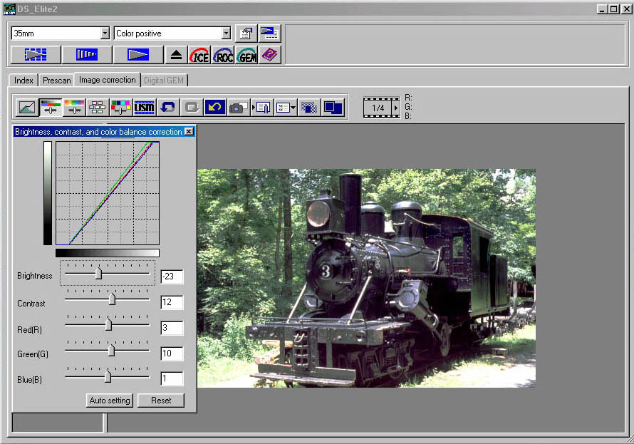 GEM stands for "Grain Equalization and Management," and is a technology to remove the effects of film grain, without affecting image sharpness. While the Digital ICE and ROC features don't provide any adjustments in the scanner software, other than the ability to activate and deactivate them, Digital GEM lets you control the intensity of the effect according to the amount of grain in the image. Once you set the amount of GEM to apply, the scanner scans a small crop of the image and displays it in a second preview window, allowing you to verify the results. Though the process can be time-consuming, GEM can do a surprisingly effective job of cleaning up overly-grainy film. (Overall, GEM is much more useful than it was when I first encountered it on a scanner over two y ears ago: With multi-gigahertz processors readily available, the amount of processing it requires is much more easily accommodated than it once was.)