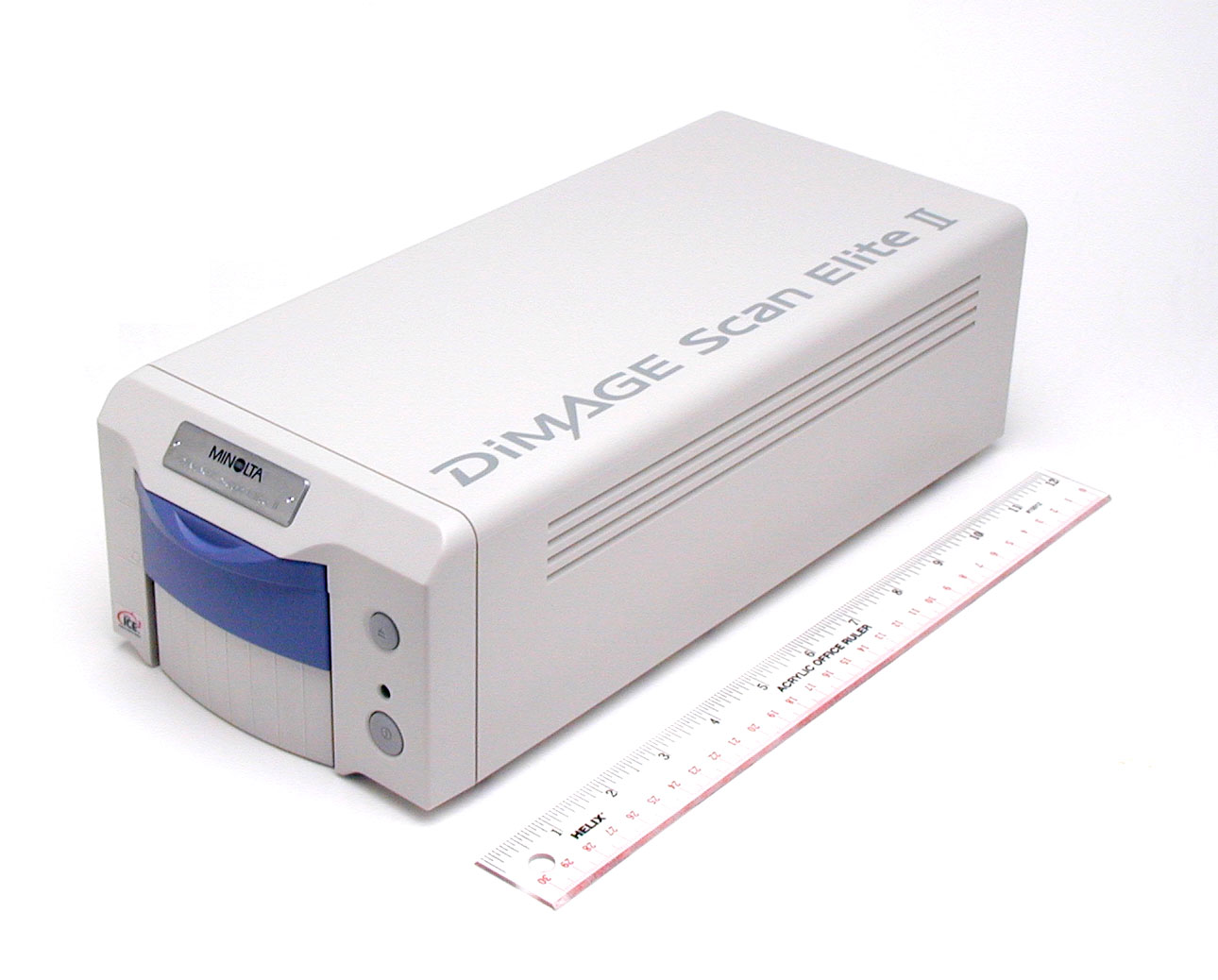 An upgrade to their Dimage Scan Elite (which I reviewed previously), the Dimage Scan Elite II replaces the earlier model's SCSI host connection with dual USB/FireWire (IEEE 1394) interfaces and upgrades the A/D converter to 16 bits. It also offers expanded color management options, and adds Digital ROC and GEM processing to the Digital ICE seen in the original Elite. The Elite II has a short/wide profile more reminiscent of the Dimage Scan Multi Pro than the taller design of the original Elite. Dimensions are 5.7 x 3.9 x 12.8 inches (145 x 100 x 325 millimeters), and the unit weighs in at 3.3 pounds (1.5 kilograms). The standard unit ships equipped to scan 35mm film, and an optional adapter allows scanning of APS film.
