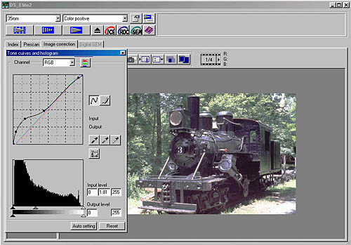 I like the way this control panel combines the tone curve and histogram controls into a single interface, yet keeps them separate so you can see what you're doing. The two graphs are linked so that changes on either graph affect the other one, but you can use both independently. For some tough pieces of film, I found the histogram best for making the gross adjustments, and the curves tool better for fine tweaks in specific tonal ranges. Very slick.